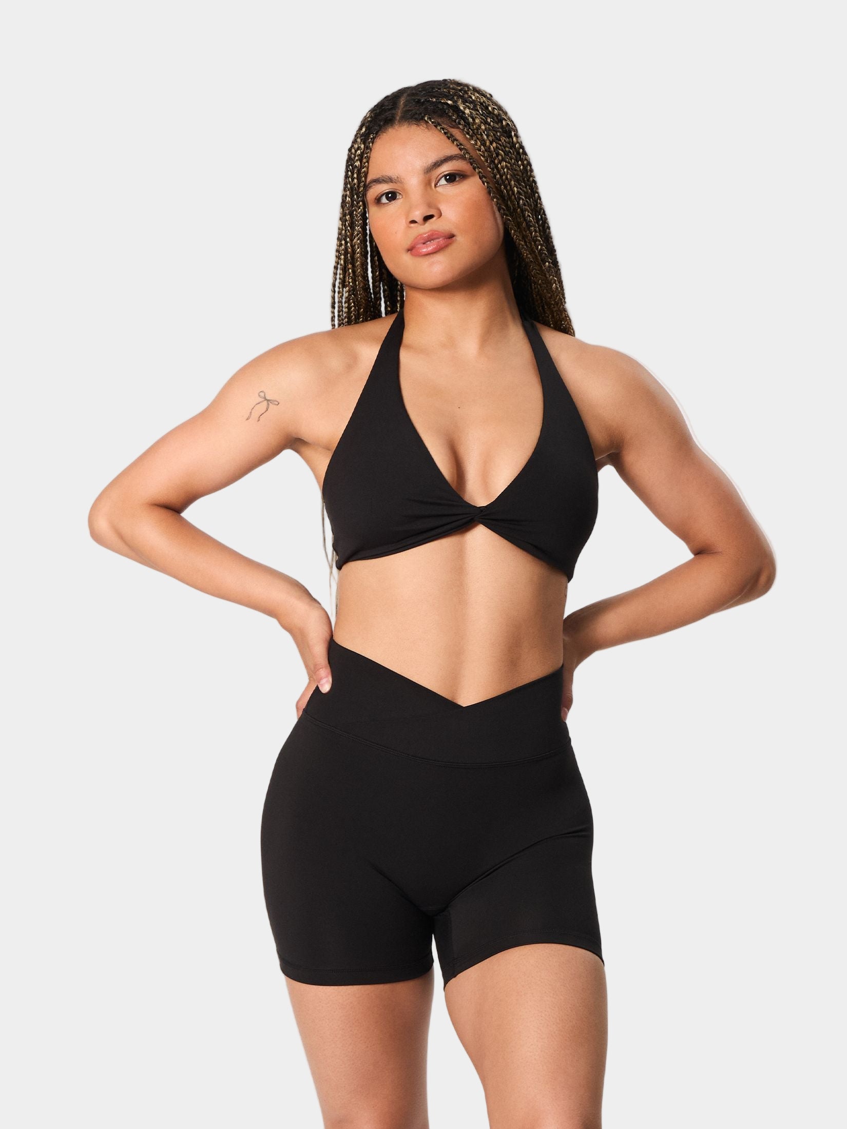 Minimal, feminine, and made to move. The Essential Halter Knot Bra features a flattering halter neckline and a delicate front knot detail.