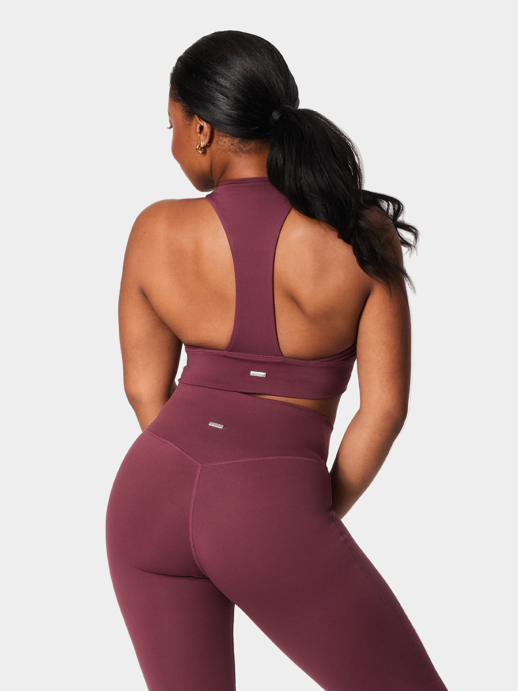 The unique back design adds a modern, feminine touch while allowing for breathability and ease of movement. Made from our signature Essentials fabric, it offers a smooth, sleek feel with medium support—perfect for higher-impact workouts or styled on the go.