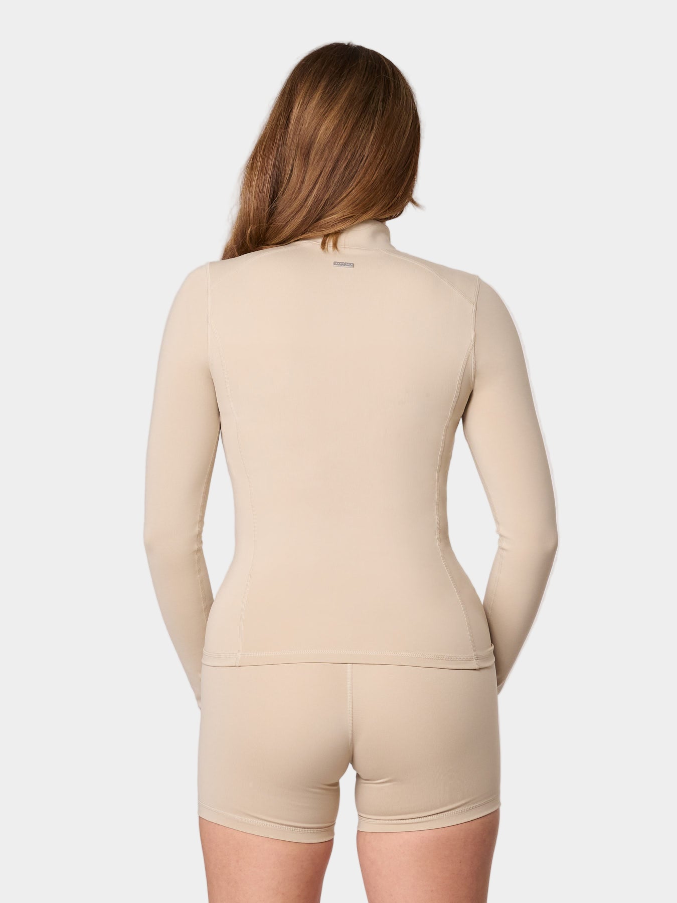 This jacket features zip pockets seamlessly integrated into the contoured waist seams for secure storage while maintaining a sleek look. The hip-length design offers a flattering fit, making it a versatile staple in your wardrobe.